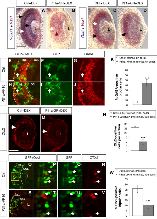 Figure 7. Ptf1a overexpression triggers the conversion of glutamatergic bipolar interneurons into GABAergic cells. (A-D) Double in situ hybridization analysis of Vsx1/VGlut1 or Vsx1/Gad co-expression (stage 39/40), following Ptf1a-GR injection in both blastomeres of two cell stage embryos. (A) In control retinas, VGlut1 stains ganglion (black arrow) and photoreceptor cells (black arrowhead) and colocalizes with Vsx1 in bipolar cells (white arrow). (B) Double VGlut1/Vsx1 staining is highly reduced in Ptf1a overexpressing retinas (white arrow: region of double staining persistence, red arrow: Vsx1-positive region with no VGlut1 staining). (C) Gad (white arrow) and Vsx1 (black arrow) have exclusive expression patterns in control retinas. (D) Upon Ptf1a overexpression, regions of double Gad/Vsx1 staining become apparent (arrow). (E-K) Analysis of GABAergic bipolar cell proportion in stage 40/41 retinas, following Ptf1a-VP16 lipofection. (E-J) Typical sections of retinas transfected with gap-GFP alone (E-G) or gap-GFP plus Ptf1a-VP16 (H-J), immunostained with an anti-GABA antibody. Arrows point to a transfected GABA-negative bipolar cell in a control retina (E-G) and to a GABA-positive one in Ptf1a-VP16 overexpressing retina (H-J). (K) Quantification of GABA-positive bipolar cells among transfected cells. (L-N) Immunofluorescence analysis of Otx2 expression (stage 39), following Ptf1a-GR injection in one of two blastomere of two cell stage embryos. (L, M) Typical sections of control (L) and Ptf1a overexpressing (M) retinas immunostained for Otx2 (arrow). (N) Quantification of Otx2-positive cells per retinal section in each condition. (O-W) Analysis of Otx2-positive bipolar cell proportion in stage 40/41 retinas, following Ptf1a-VP16 lipofection. (O, V) Typical sections of retinas transfected with GFP alone (O-R) or GFP plus Ptf1a-VP16 (S-V), immunostained with an anti-Otx2 antibody. (P-R) and (T-V) are higher magnifications of the delineated regions in O and S, respectively. Arrows point to transfected Otx2-positive bipolar cells in a control retina (P-R) and Otx2-negative ones in Ptf1a-VP16 overexpressing retina (P-R). (W) Quantification of Otx2-positive bipolar cells among transfected cells. Values are given as mean +/- s.e.m. p < 0.001 (***)(Student's t test in N, binomial test in K and W). Ctrl: control; L: lens; INL: inner nuclear layer; GCL: ganglion cell layer. Scale Bar represents 50 μm in A-D, L, M and 30 in E-J, O-V.