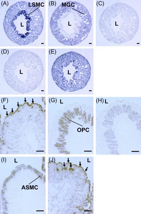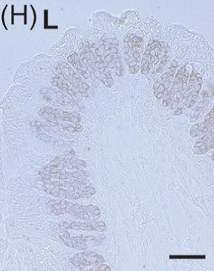 The amphibian gastrointestinal tract is remodeled from a larval-type to an adult-type during metamorphosis. In the present study, we examined the products of subtractive hybridization between tadpole and frog stomach cDNAs of Xenopus laevis in order to identify genes expressed specifically in the larval stomach epithelium. A new gene homologous to xP1 was obtained and named xP1-L. In the genome database of Silurana tropicalis, we found a homologue of xP1-L and named it stP1-L. RT-PCR showed that the expression of xP1-L was detected in stage 41/42 tadpoles. In addition, in situ hybridization showed that xP1-L was localized to surface mucous cells of the larval stomach. The H(+)/K(+)-ATPase beta subunit, a marker gene for manicotto gland cells in the tadpole stomach, was also detected at the same time. However, adult marker genes such as xP1 for surface mucous cells and pepsinogen C (PgC) for oxynticopeptic cells were not expressed in the tadpole stages. The expression of xP1-L gradually decreased towards the metamorphic climax and disappeared after stage 61 when larval-type gastric epithelium is replaced by adult-type. We found that xP1-L was never expressed in surface mucous cells of the adult-type stomach, and xP1, instead of xP1-L, was expressed. During T3-induced metamorphosis, xP1-L expression decreased in the same manner as during natural metamorphosis. Thus, xP1-L is a useful marker for larval surface mucous cells in tadpole stomach. This is the first demonstration of a marker gene specific for the surface mucous cells of the larval stomach.