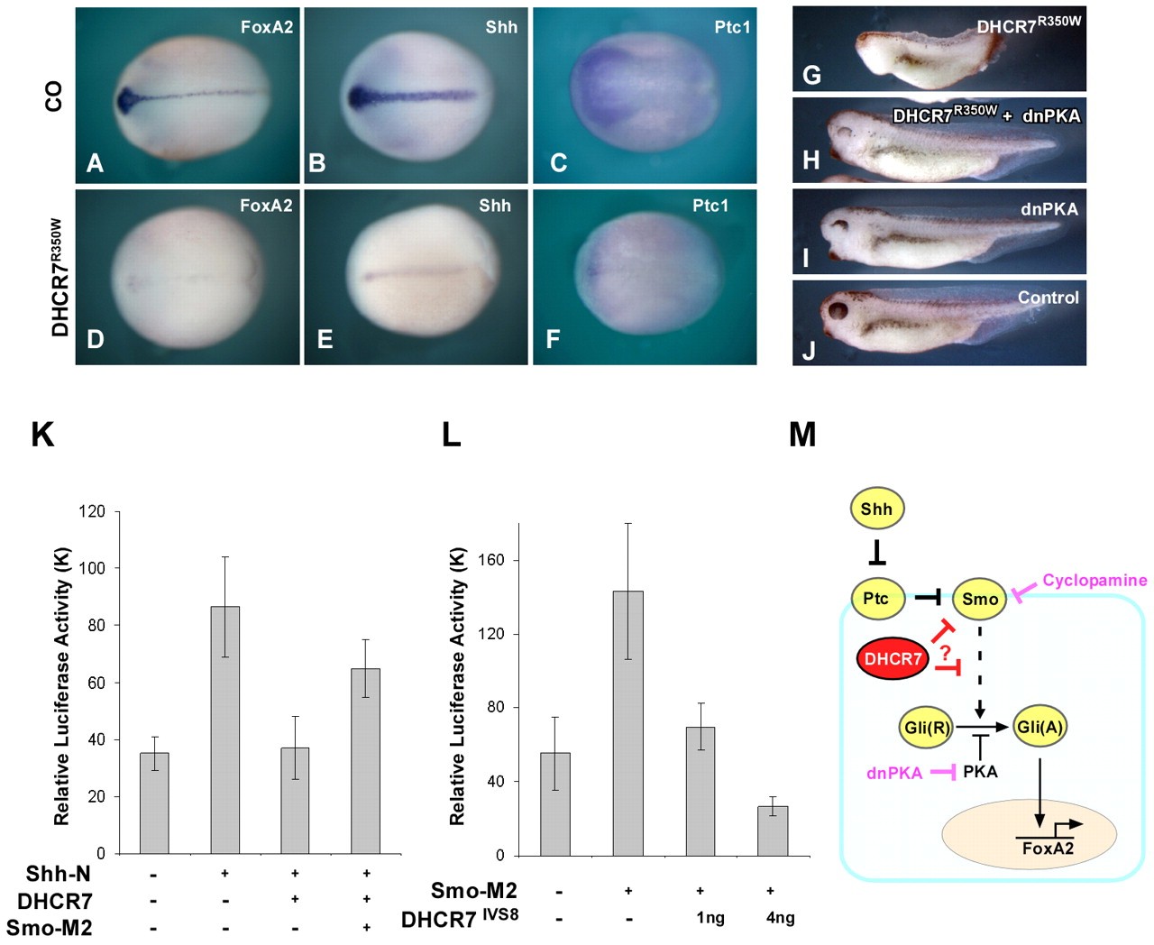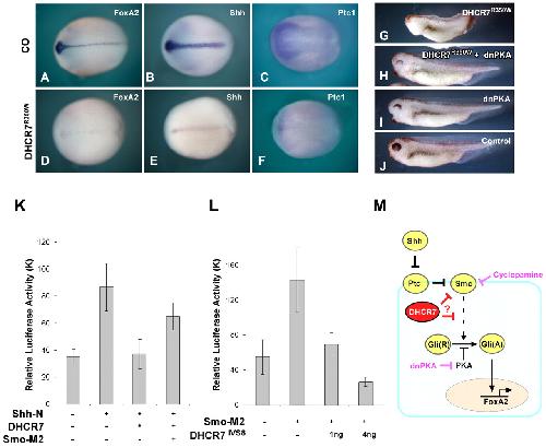 Fig. 8. The effects of DHCR7 impinges on Smo. (A-F) Microinjection of DHCR7R350W mutant inhibits endogenous Shh signaling. Embryos microinjected with 1 ng of DHCR7R350W mRNA inhibits the expression of FoxA2, Shh and Ptc-1. (G-I) Microinjection of mRNA (500 pg) encoding dnPKA inhibits the cyclopic phenotype caused by DHCR7R350W. (J) Control uninjected embryo. (K) Smo-M2 rescues DHCR7-mediated Hh signaling inhibition. Embryos were co-injected with 8Ã3â²Gli-BS Luc together with Chordin, Shh-N, DHCR7 or Smo-M2 mRNA (0.5 ng), or in combination, and the reporter gene activity was measured. (L) DHCR7IVS8-1G>C blocks Gli reporter activation mediated by Smo-M2. Embryos were co-injected with Gli reporter together with Chordin, DHCR7IVS8-1G>C or Smo-M2 mRNA, or in combination, and reporter gene activity was measured. (M) Model for the role of DHCR7 in Shh signaling. Shh inactivates Ptc, thus permitting the activation of Smo. Activated Smo transmits a Shh signal to activate Gli protein. PKA inhibits Gli activation. DHCR7 inhibits Shh signaling either at the level of or downstream of Smo. |