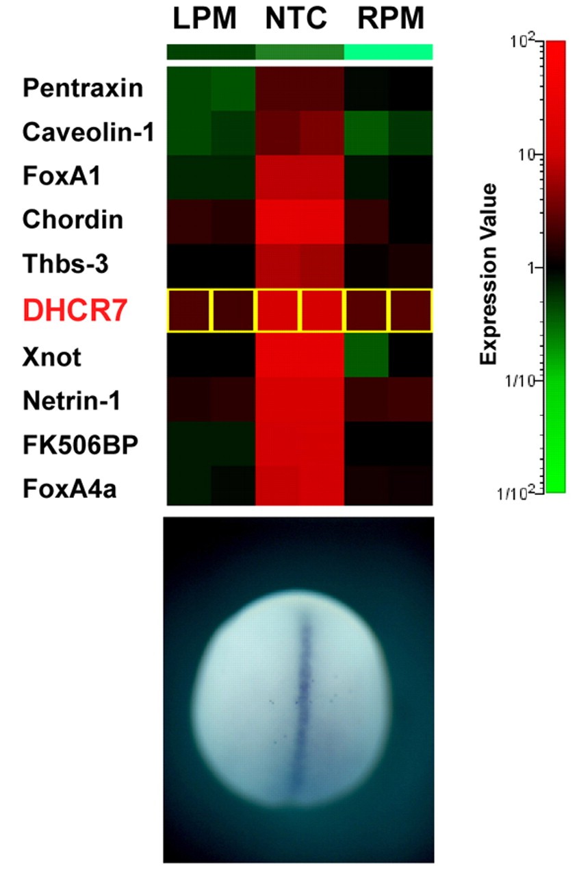 Fig. 1. Expression of DHCR7 in developing notochord. (Top) Hierarchical clustering analysis of microarray data. Each column represents a single hybridization and each row a single clone. The colors ranging from red to green correspond to increased and decreased gene expression. LPM, left presomitic mesoderm; NTC, notochord; RPM, right presomitic mesoderm. (Bottom) Whole-mount in situ hybridization revealing the expression of DHCR7 in the midline of a Xenopus neurula stage embryo. |