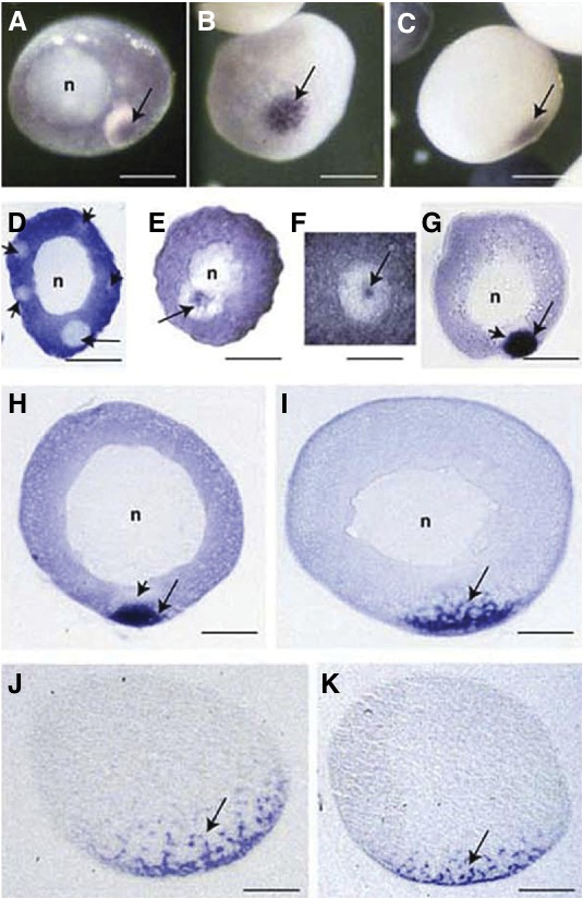 Fig. 3. Centroid mRNA localization in Xenopus oocytes. (A-C) Whole mount in situ hybridization showing localization of centroid mRNA (arrows) in the mitochondrial cloud in a stage 1 oocyte (A) and in the apex of the vegetal cortex in a stage II oocyte (B) and a stage III oocyte (C). (D- J) Sections of whole mount in situ hybridization showing localization of centroid mRNA in oocytes at different stages. (D) In a pre-stage I oocyte, centroid mRNA is uniformly dispersed in the cytoplasm but excluded from the mitochondrial cloud (long arrow) and secondary clouds (short arrows). (E,F) In a stage I oocyte, centroid mRNA (arrow) is located in the center of the mitochondrial cloud. Panel (F) shows the high magnification of the mitochondrial cloud (white sphere) with centrally located centroid mRNA (arrow). (G,H) In late stage I/early stage II and stage II oocytes, centroid mRNA is limited to the vegetal tip of the mitochondrial cloud (co- localizing with the germ plasm [long arrow]) and is excluded from the apical part of the mitochondrial cloud (short arrows). (I-K) Stage III, early stage IV and stage IV oocytes showing localization of centroid mRNA in the islands of a dispersing mitochondrial cloud (arrows). n, nucleus. Scale barsareequalto56μmin(A),90μmin(B,G),100μmin(C),70μmin(D), 75 μm in (E), 65 μm in (F), 86 μm in (H), 80 μm in (I) and 100 μm in (J,K).
