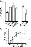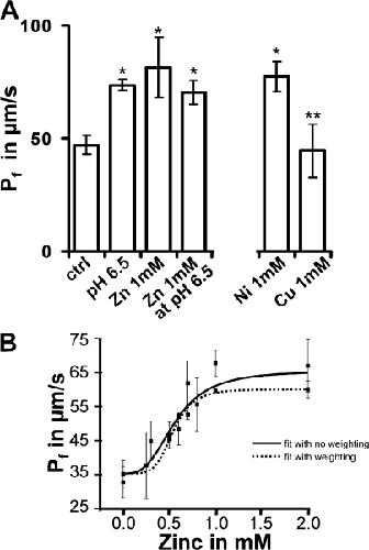 Figure 2. (A) Effect of pH 6.5, 1 mM ZnCl2, NiCl2, or CuCl2 on the water permeability of AQP0. Zinc did not have any additional effect on water permeability at pH 6.5, suggesting that low pH and zinc act at the same site or sites to increase AQP0 water permeability. Nickel increased Pf (from 47 ± 4.2 to 77.3 ± 6.6 μm/s). By contrast, copper had no effect. *, different from control at a significance of P < 10−5; **, not significantly different from control P > 0.5 using the Student's t distribution. (B) Dose–response curve of the water permeability of AQP0. Fitting with no weighting (continuous line) gives a Hill coefficient of three, suggesting a highly cooperative binding for zinc. Statistical parameters for the no-weighting fit are as follows: reduced ξ2 = 17.1, R2 = 0.9, ΔPfMax = 30.3 ± 4.8, n = 3.0 ± 1.2, K = 0.6 ± 0.1, Pf0 = 35.3 ± 2.7. Using instrumental weighting, where the points are weighted according to their standard errors (dotted curve) gives a Hill coefficient of 5. Statistical parameters for the weighted fit are as follows: reduced ξ2 = 1.4, R2 = 0.9, ΔPfMax = 25.4 ± 3.0, n = 5.1 ± 0.9, K = 0.54 ± 0.02, Pf0 = 35.3 ± 2.7. While both curves appear to fit the data well, the instrumental fit has considerably better statistics and also gives a greater Hill coefficient. Each data point is the average of experiments using nine oocytes from three different batches.
