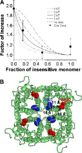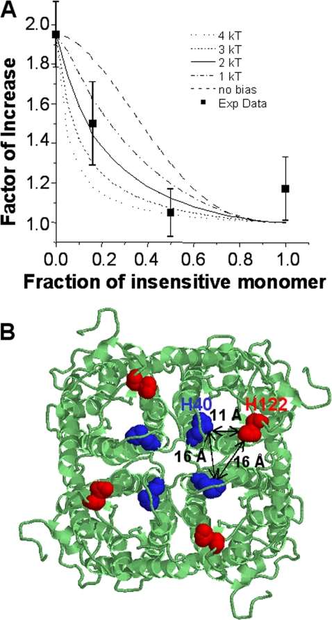Figure 4. (A) Plots of biased binomial predictions of the factor of increase assuming that two insensitive monomers are required to render the heterotetramer insensitive to zinc. Curves are shown for incorporation of mutant AQP0 in the heterotetramer biased by 0, 1, 2, 3, or 4 kT per contact face. Only the 2 kT curve fits the experimental data. (B) Overview of AQP0 tetramer structure. His40 is shown in blue and His122 in red. The tetramer is shown from the extracellular side looking down the pores. The coordinates used to generate the figure were from the published structure of AQP0 (PDB: 6B0P). We used proteinexplorer.org (http://molvis.sdsc.edu/protexpl/frntdoor.htm).