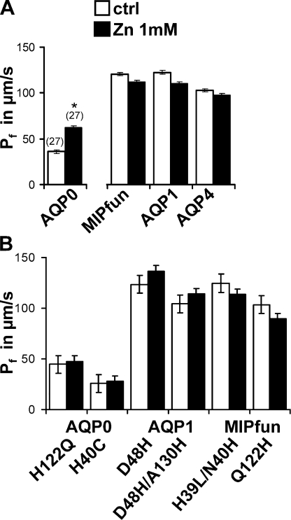 Figure 1. (A) Effect of 1 mM ZnCl2 on the water permeability of AQP0, MIPfun, AQP1, and AQP4. Only AQP0 showed zinc-induced increase in water permeability (from 35.9 ± 2.5 to 62.3 ± 5.5 μm/s). (B) Effect of 1 mM ZnCl2 on the water permeability of mutants of AQP0, AQP1, and MIPfun. They all lacked the zinc sensitivity. *, different from control at a significance of P < 10−5 using the Student's t distribution. Unless otherwise noted, each data point is the average of experiments using nine oocytes from three different batches.