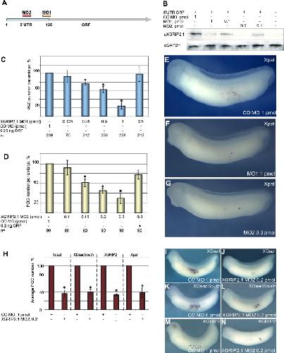 Positioning of PGCs along the A/P axis in control and XGRIP2.1 morphant embryos. (AâH) Representative examples of uninjected control embryos exhibiting normal PGC positioning between stage 24 and stage 32. PGCs were stained for Xpat and somites for XMyoD by WMISH. (AâG) Embryos were cleared with benzyl benzoate/benzyl alcohol. (H) PGC migration profile of uninjected control embryos (stage 24â33). (J) The PGC distribution profile of embryos at stage 32 injected vegetally into both blastomeres at the 2-cell stage with 0.2 pmol of MO2 XGRIP2.1 or CO MO. Average PGC numbers at each somite position were calculated from results of 3 independent experiments. A total of 60 embryos were analyzed for each stage of development or treatment.