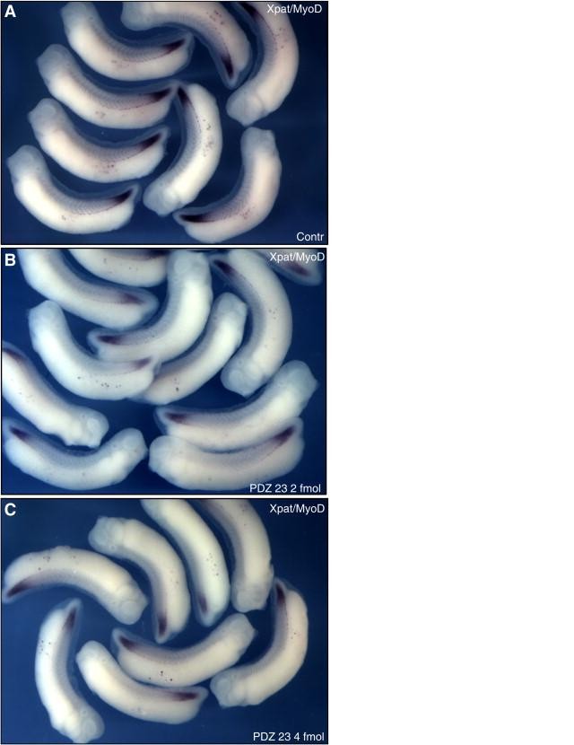 Fig. 3. Examples of phenotypes induced by overexpression of PDZ 23. Embryos were injected vegetally into both blastomeres at the 2-cell stage, grown to stage 31-32 and subjected to WMISH. (A) Control embryos exhibit normal average PGC numbers and positioning along the A/P axis. (B, C) Embryos injected with 2 fmol (B) or 4 fmol (C) of PDZ 23 RNA exhibit reduced average PGC numbers and PGC mislocalization along the A/P axis.