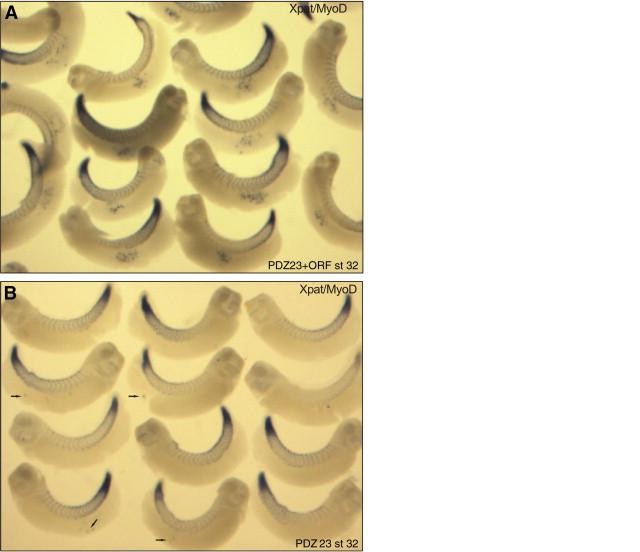 Fig. 4. Rescue of PDZ 23 induced effects upon coinjection of the wtORF. Embryos were injected with 2 fmol of PDZ 23 RNA alone or together with 0.2 ng XGRIP ORF vegetally into both blastomeres at the 2-cell stage, grown to stage 32, subjected for the whole-mount in situ hybridization and cleared with benzyl benzoate/ benzyl alcohol (2:1). (A) Embryos coinjected with PDZ 23 and XGRIP ORF exhibit a normal average number and regular positioning of PGCs along the A/P axis. (B) Embryos injected with PDZ 23 alone exhibit reduced average PGC numbers, as well as PGC mislocalization along the A/P axis (arrows).
