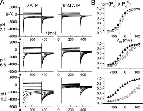 Figure 1. Effects of 1 mM cytoplasmic ATP on CLC-1 at three intracellular pH conditions. (A) Recording traces were obtained in the indicated pH and ATP conditions using voltage protocol A. (B) Normalized current (Inorm) represents the initial, tail current normalized to the maximal initial current in the absence of ATP. Each data point is the average from 3–6 patches. This Inorm value reflects the product of the fast-gate Po and the common-gate Po, namely Pof × Poc. Solid and open symbols were in 0 and 1 mM cytoplasmic ATP, respectively.