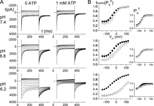 Figure 2. Effects of 1 mM ATP on the common gate of CLC-1. (A) Recording traces obtained in the indicated conditions using voltage protocol B. (B) Normalized value of the initial tail current (Inorm) in each pH condition (as shown in A). This Inorm value has been widely used to represent the Po of the common gate (Poc). Dividing the Inorm in Fig. 1 B (from protocol A) by the Inorm here (from protocol B) gives the fast-gate Po (Pof), which is shown in the inset of each panel. Solid and open symbols were obtained in 0 and 1 mM cytoplasmic ATP, respectively.