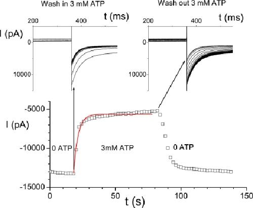 Figure 4. Reversible ATP inhibition on the CLC-1 common-gate activity at pH 6.8. Top panels show recording traces by a pulse protocol of +40 mV test voltage (300 ms), followed by the short pulse to +170 mV (400 μs), and finally the tail voltage step at −120 mV. The recorded traces were shown around the initial tail current for those traces during ATP wash-in (left) and wash-out (right). Each recording trace is separated by 2 s, and the initial value of the tail current in each trace is plotted against time at the bottom panel. The red curve represents a single-exponential fit with a time constant of 3.4 s, which does not fit the ATP wash-in process well. Three other patches show the same results from such ATP wash-in and wash-out experiments.