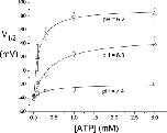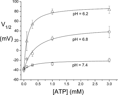 Figure 3. Dependence of the V1/2 of the common-gate Poc–V curve on the ATP concentration in three different pH conditions. Each data point is the average from 3–7 patches. Solid curves are drawn according to a Michaelis-Menten equation with the ATP half-effective concentration and the saturated V1/2 value of 0.31 mM and −20 mV (pH 7.4), 0.40 mM and +49 mV (pH 6.8), and 0.12 mM and +91 mV (pH 6.2).