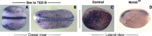 Fig. 5. TEX15, a ciliated cell marker is expressed in presumptive ciliated cells and other ciliated tissues and is negatively regulated early on by Notch. TEX15 is expressed in ciliated tissues such as the midline (A) and the future ear (B). Expression in presumptive ciliated cells in early development (C) is severely reduced by Notch-icd (D). |
