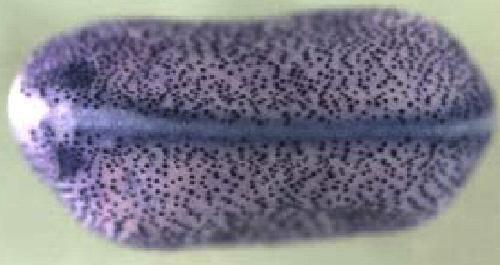 tex15 (testis expressed 15) gene expression in Xenopus laevis, assayed via in situ hybridization, NF stage 21, dorsal view, anterior left. |