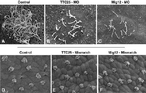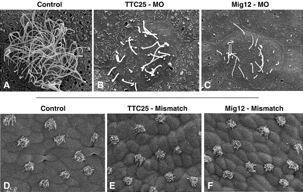 Fig. 10. SEM confirms suppression of ciliogenesis in Mig12 and TTC25 morphants. (A) High magnification view of a control cell shows multiple, long cilia on the apical cell surface. (B, C) TTC25 morphants and Mig12 morphants both exhibit fewer, shortened apical cilia. (DâF) Five-base-pair mismatch morpholinos for TTC25 and Mig12 exhibit no ciliogenesis defects. |