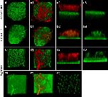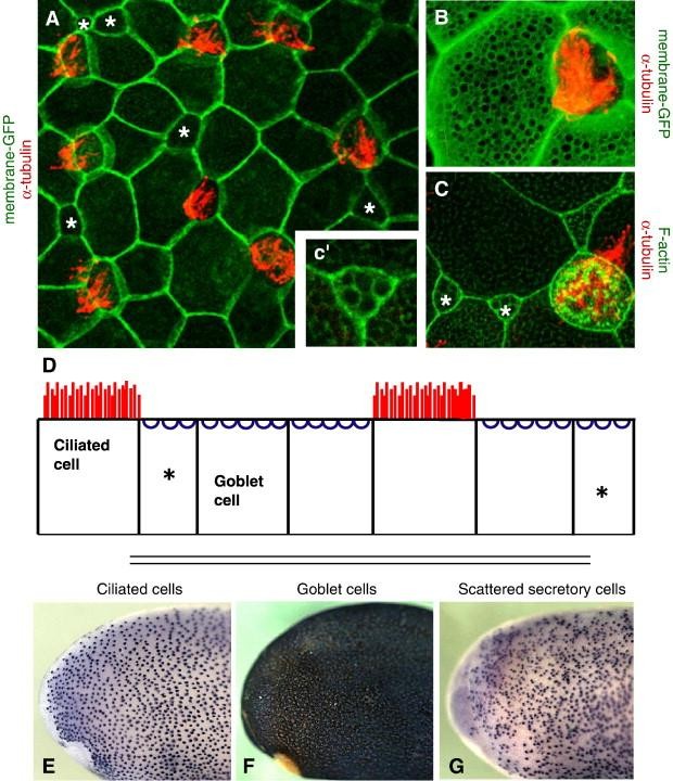 Fig. 1. A screen for differentially expressed genes in a mucociliary epithelium. (A) The Xenopus epidermis is a salt-and-pepper mix of mucus-secreting goblet cells and ciliated cells. Ciliated cells are marked by red α-tubulin staining. Small secretory cells are labeled with an asterisk. All other cells are goblet cells. (B) At higher magnification, membrane-GFP (green) reveals numerous exocytic vesicles at the apical surface of goblet cells, and α-tubulin staining (red) reveals cilia. (C) The vesicles of small secretory cells are shown by phalloidin stain (green) and a neighboring ciliated cell is marked by alpha-tubulin stain (red). (câ²) A high magnification view of a small secretory cell shows visible vesicles. (D) A diagram of cell types in the Xenopus epidermis. Goblet cells are the predominant cell type. Ciliated and small secretory cells (asterisks) are scattered throughout. (E) In situ hybridization for genes expressed in ciliated cells produces regularly spaced dark spots on a light background. (F) Genes expressed in goblet cells produce a reciprocal pattern. (G) Small secretory cells are visible as unevenly scattered dark spots. The full set of differentially expressed genes can be found in Supplemental Table 1. |