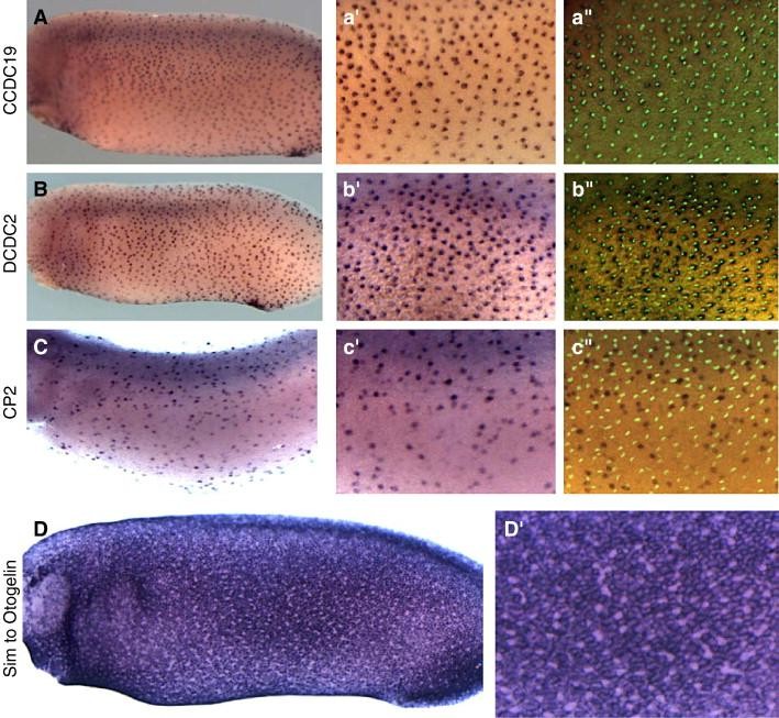 Fig. 3. Representative expression patterns from screen. Expression of coiled-coil domain containing 19, (A) and Doublecortin domain-containing 2 (B) in ciliated cells are evenly spaced and colocalize with α-tubulin marking cilia. (C) The transcription factor CP2 is expressed in the scattered secretory cells, and its expression does not colocalize with cilia. (D) Similar to Otogelin is expressed in mucus-secreting goblet cells covering much of the epidermis. High magnification view reveals absence of expression in scattered secretory and ciliated cells. |
