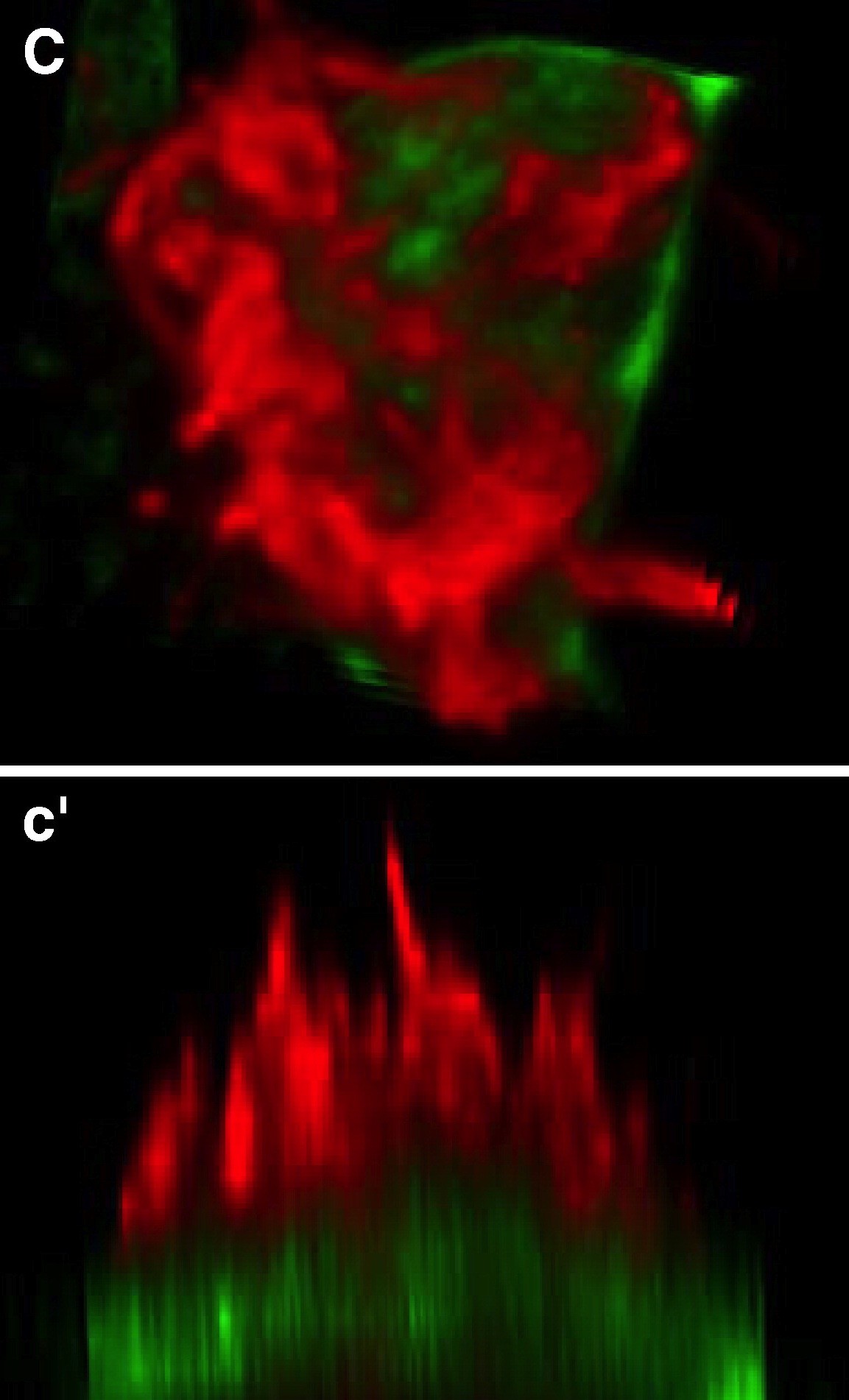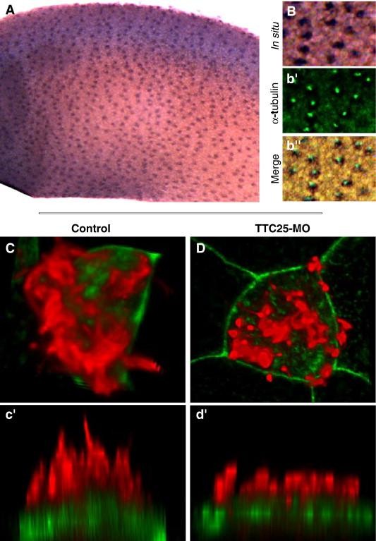 Fig. 8. TTC25 is required for ciliogenesis. (A) TTC25 is expressed in the evenly distributed pattern of ciliated cells, and colocalizes with cilia (Bâbâ²). (C) Ciliated cells in normal embryos develop dozens of long, thin cilia (red, anti-α-tubulin staining). (câ²) Side view of cell shown in panel A. (D, dâ²) Ciliated cells in embryos injected with TTC25 MO develop only short, fat cilia. Such diminutive cilia have also been observed in embryos mutant for IFT proteins (Huangfu and Anderson, 2005). |