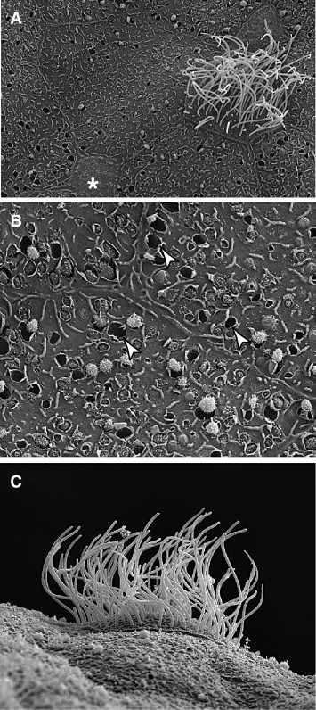 Fig. 2. Ultrastructure of the Xenopus epidermis. (A) View of mucociliary epithelium including a ciliated cell, small secretory cell (marked by â) and several large goblet cells. (B) Goblet cells contain empty vesicles, noted with arrowheads, and vesicles with secretory granules being exocytosed. (C) Lateral view of a ciliated cell, showing the many motile, apical cilia. |
