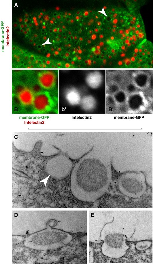Fig. 4. Goblet cells in the Xenopus epidermis secrete Intelectin-2. (A) A Xenopus epidermis goblet cell; membrane-GFP (green) reveals the extensive exocytic vesicles; antibody staining demonstrates the presence of intelectin-2 (red) in these vesicles. Arrows mark vesicles absent of intelectin-2. (BâBâ²) High magnification of exocytic vesicles shown in panel A. (CâE) Transmission electron microscopy of a Xenopus epidermis goblet cell. (C) Three apically located vesicles at different stages of exocytosis are visible in an epidermal goblet cell. A mucus granule can be seen in the process of being secreted. (D) Membrane fusion intermediate during exocytosis. (E) Exocytic release. |