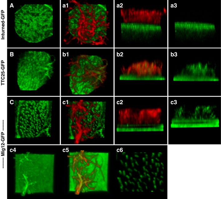 Fig. 7. Mig12 and TTC25 localize to basal bodies and ciliary axoneme. Inturned-GFP, shown here as a reference, is localized at the apical surface of the ciliated cell, but is not in the ciliary axoneme (Aâa3). TTC25-GFP localizes to apical foci, presumably basal bodies, and also to the ciliary axoneme (Bâb3). Mig12-GFP localizes to both basal bodies and the ciliary axoneme (Câc3). At normal gain levels, Mig12-GFP localizes very specifically to the basal bodies (C), clearly marking basal body orientation and ciliary polarity (c6). At high gain levels, the presence of Mig12-GFP in the ciliary axoneme is more apparent (c4âc5). |