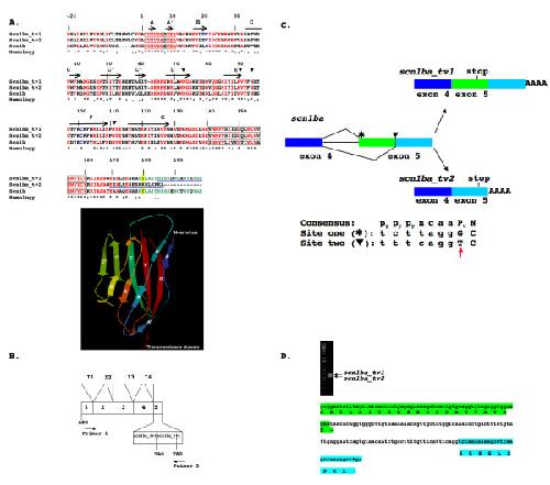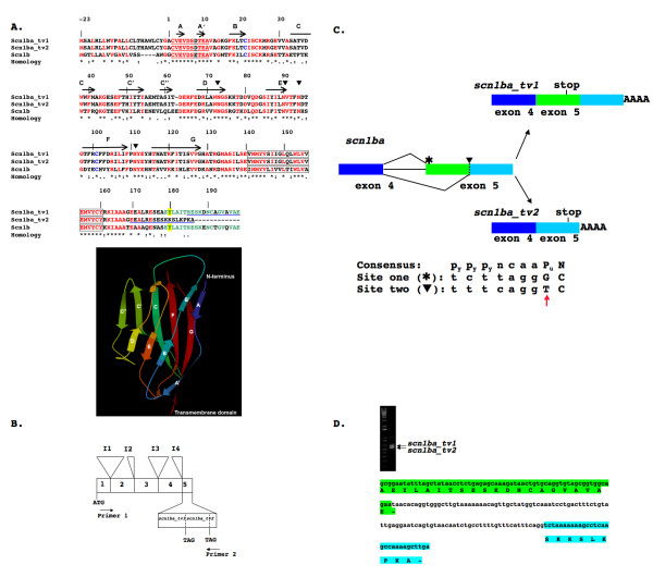 Figure 1. Zebrafish scn1ba_tv1 and scn1ba_tv2 are splice variants. A. Upper panel: Comparison of Scn1ba_tv1, Scn1ba_tv2 and Scn1b amino acid sequences. Amino acid residues that are identical are indicted in red, strongly similar substitutions are indicated by (:), and weakly similar amino acids are indicated by (.). Identical resides in exon 5 of Scn1ba_tv1 and Scn1b are indicated in green. The two cysteine residues predicted to form the Ig loop are indicated in blue. The conserved regions that form the A/A' face of the Ig loop, sites of interaction with theα subunit [17], are underlined. Tyrosine-181 in Scn1b and the corresponding residues in Scn1ba_tv1 and Scn1ba_tv2 are highlighted in yellow. Predicted sites of N-linked glycosylation are indicated by ▼. These sites were determined using NetNGlyc 1.0 [61]. Transmembrane segments are indicated as boxes. Peptides used for antibody generation are underlined in blue. Predicted β-sheets in the Ig loop domain, based on the crystal structure of myelin P0 [62], are shown with labeled arrows and correspond to the ribbon diagram included in the lower panel. Lower panel: Proposed three-dimensional structure of the Ig domain of β1 using the crystal structure of myelin Po (PDB 1NEU) as a template. The figure was created with the KiNG Viewer program via the RCSB Protein Data Bank web site [63]. β strands corresponding to the arrows in the upper panel are labeled A through G. B. Schematic showing the genomic organization of zebrafish scn1ba. The positions of introns 1 through 5 (I1 – I5) are indicated. Positions of primers used for RT-PCR in panel D are indicated. The C-terminal alternate splice domains contained in scn1ba_tv1 and scn1ba_tv2 are encoded by exon 5. C. Model of alternative splicing of scn1ba. Exons 4 and 5 (boxes) and intron 4 (line) are illustrated. The splice acceptor sequence at the beginning of exon 5 is indicated by and the internal alternate splice acceptor site in exon 5 is indicated by a dashed line and by ▼. The location of stop codons in the resulting mRNAs are indicated. Drawings are not to scale. Consensus splice acceptor sequence [22] and the acceptor sequences found in exon 5 are indicated in the lower portion of the panel. Py: pyrimidine. Pu: purine. Lower case: intronic sequence. Upper case: exonic sequence. The T indicated by the red arrow in the internal, alternate acceptor is rare and significantly weakens the site [22]. D. RT-PCR from whole fish RNA demonstrating that both splice variants of scn1ba are expressed in the mRNA pool. The upper band corresponds to scn1ba_tv1 and the lower band corresponds to scn1ba_tv2. Translations of the resulting alternate C-terminal splice products are shown below. The sequence highlighted in green is found in Scn1ba_tv1 and corresponds to the green portion of exon 5 illustrated in panel C. The sequence highlighted in turquoise is found in Scn1ba_tv2 and corresponds to the turquoise portion of exon 5 illustrated in panel C.