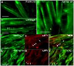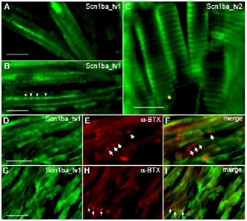 Figure 10. Zebrafish Scn1ba_tv1 and Scn1ba_tv2 are expressed in skeletal muscle. A, B, D, E, F: Anti-Scn1ba_tv1 β1 (green), α-bungarotoxin (BTX) (red). C. Anti-Scn1ba_tv2 (green). Labeling with anti-Scn1ba_tv1 produced two different staining patterns; staining at the t-tubules of striated muscle (A, D, and G), and punctate staining along the longitudinal edge of the muscle cells (arrowheads in B). Staining with anti-Scn1ba_tv2 labeled the t-tubule system and did not appear to label to muscle surface. Anti-Scn1ba_tv1 staining did not colocalize with α-BTX (D – F and H – I), suggesting that Scn1ba_tv1 is not expressed at neuromuscular junctions (arrows). Scale bar: 10 μm.
