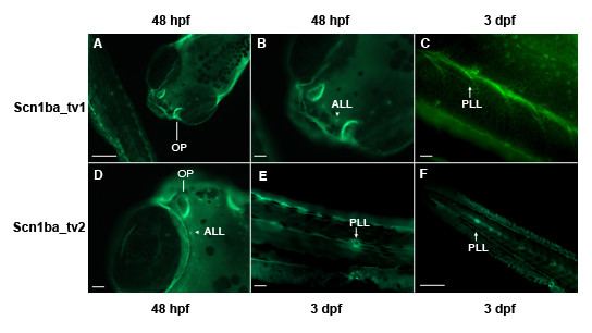 Figure 4. Zebrafish Scn1ba_tv1 and Scn1ba_tv2 expression in early sensory systems. Panels A – C: anti-Scn1ba_tv1. Panels D – F: anti-Scn1ba_tv2. A. 48 hpf fish showing staining in the olfactory pit (OP) and in neuromasts of the anterior (ALL) and posterior (PLL) lateral line systems. B. Higher magnification of head region from panel A showing the anterior lateral line (ALL). C. 3 dpf fish showing staining in the posterior lateral line (PLL) of the trunk. D. 48 hpf fish showing staining in olfactory pit (OP) and anterior lateral line (ALL). E. 3 dpf fish showing staining of a neuromast in the posterior lateral line (PLL). F. 3 dpf fish showing staining in multiple neuromasts in the trunk corresponding to the posterior lateral line (PLL) system. Scale bar: 50 μm.