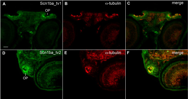 Figure 5. Zebrafish anti-Scn1ba_tv1 and anti-Scn1ba_tv2 stain olfactory pits. A – C: anti-Scn1ba_tv1 (green), anti-acetylated α-tubulin (red). D – F: anti-Scn1ba_tv2 (green), anti-acetylated α-tubulin (red). OP: olfactory pit. Scale bar: 50 μm.