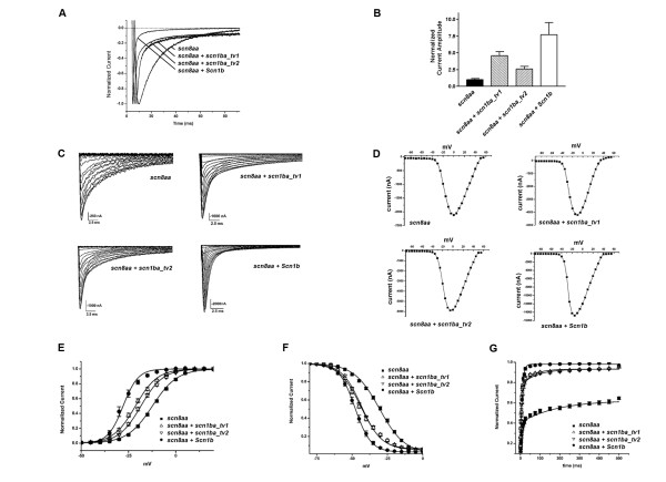 Figure 11. Zebrafish β1 subunits modulate scn8aa. A. Normalized Current Traces. Effects of rat and zebrafish β subunits on current time course. Each trace shows the mean current elicited by depolarization to 0 mV from a holding potential of -80 mV in oocytes injected with the indicated combinations of α and β subunits. B. Current Density. Coexpression of scn1ba_tv1, scn1ba_tv2, or Scn1b cRNA with scn8aa cRNA results in increased current amplitude compared to α alone. Individual peak current amplitudes for each condition were measured and normalized to the mean current amplitude of scn8aa for each experiment to account for variability between different oocyte preparations. C. Representative Na+ current traces for scn8aa alone (upper left), scn8aa plus scn1ba_tv1 (upper right), scn8aa plus scn1ba_tv2 (lower left), and scn8aa plus Scn1b (lower right) D. Current-voltage relationships for the families of Na+ currents shown in panel C. E. Voltage dependence of activation. Coexpression of scn8aa with Scn1b (●), scn1ba_tv1 (△), or scn1ba_tv2 (▽) results in hyperpolarizing shifts in the voltage dependence of activation compared to the expression of scn8aa alone (■). Coexpression of scn8aa with scn1ba_tv1 results in a significantly greater hyperpolarizing shift than coexpression with scn1ba_tv2. F. Voltage dependence of inactivation. Coexpression of scn8aa with Scn1b, scn1ba_tv1, or scn1ba_tv2 resulted in hyperpolarizing shifts in the voltage dependence of inactivation compared to scna8a alone. The effects of scn1ba_tv1 and scn1ba_tv2 on the voltage-dependence of inactivation are indistinguishable from each other. G. Zebrafish β subunits speed recovery from inactivation. Coexpression of scn8aa with Scn1b (●), scn1ba_tv1 (△), or scn1ba_tv2 (▽) results in a dramatic increase in the rate of recovery from inactivation compared with scn8aa alone (■). Zebrafish scn8aa (■) expressed alone has a very slow rate of recovery, and a full recovery was never achieved during the duration of the experiment.