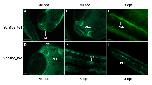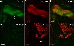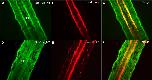 Figure 8. Zebrafish Scn1ba_tv1 but not Scn1ba_tv2 is expressed in optic nerve. Sections generated from 13 dpf zebrafish were stained with anti-Scn1ba_tv1 or anti-Scn1ba_tv2 and anti-acetylated α-tubulin. A – C: Anti Scn1ba_tv1 (green), anti-acetylated α-tubulin (red). D – F: Anti-Scn1ba_tv2 (green), anti-acetylated α-tubulin (red). Images were viewed with an Olympus FluoView 500 confocal microscope at 100× magnification with 5× additional zoom. Scale bar: 50 μm.