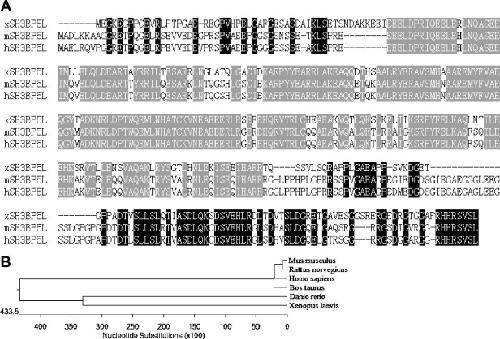 Fig. 1. Sequence analysis of xSH3BP5L. (A) Comparison of SH3BP5L proteins from Xenopus laevis (BC084800), mouse (NM_024480), and human (NM_030645). Dark and gray backgrounds represent identical amino acids. White letters on gray background indicate amino acid residues that are the sh3bp5 conserved domain. (B) Phylogenetic analysis of SH3BP5L family members using DNAstar MegAlign. Zebrafish (NM_213160); Rattus norvegicus (XM_001075049); Bos taurus (BC119925).
