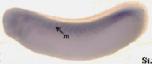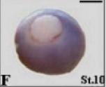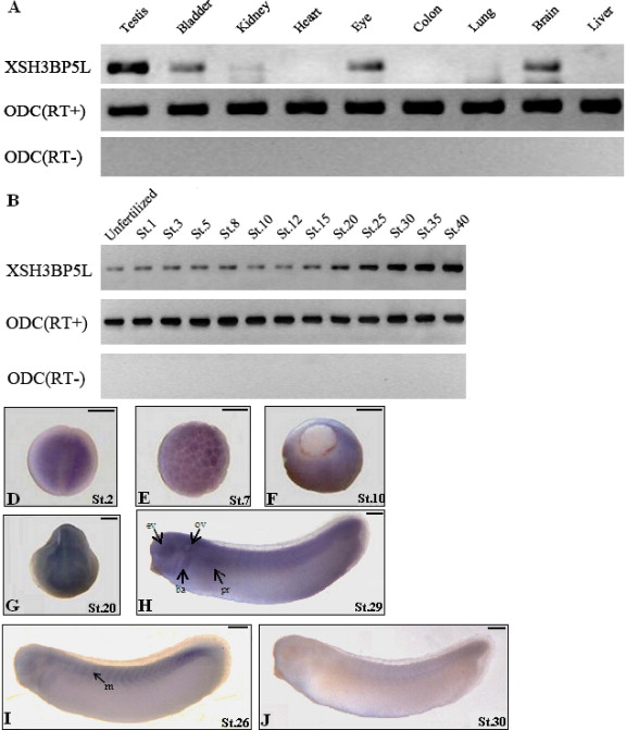 Fig. 2. Expression patterns of xSH3BP5L. (A) Temporal expression profile of xSH3BP5L analyzed by RT-PCR. Transcripts of xSH3BP5L were detected from unfertilized egg to tadpole. RT-PCR using an ornithine decarboxylase (ODC)-specific primer was carried out in parallel to control the amount of input RNA (ODC (RT+)]. RT-PCR without reverse transcriptase showed no contamination of genomic DNA (ODC (RTâ)]. (B) Tissue expression pattern of xSH3BP5L in adult frog analyzed by RT-PCR. (CâG) Whole-mount in situ hybridization reveals spatial distribution patterns of xSH3BP5L mRNA. Bars, 250 μm. (C,D) xSH3BP5L expression is detectable in animal pole cells of blastula embryos. (E) xSH3BP5L mRNA is expressed in the ventralâlateral mesoderm during early gastrulation. (F) Expression of xSH3BP5L in the head. (G) Lateral view of a stage-29 embryo, showing that xSH3BP5L mRNA is detected predominantly in eye, but faintly in bronchial arch, otic vesicle, and pronephros (arrowheads in G). (H) Embryo hybridized with Xmyod antisense probe showing muscle signals (black arrowheads). (I) Control hybridization at stage-30 with sense xSH3BP5L probe. Ba, bronchial arches; ev, eye vesicle; m, muscle; ov, otic vesicle; pr, pronephros.