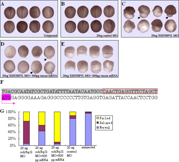 Fig. 3. Effect of xSH3BP5L MOs microinjection. Uninjected embryos (A) and embryos microinjected with 20 ng control MO (B) showed normal at stage-15. (C) Embryos microinjected with 20 ng xSH3BP5L MO exhibited delayed blastopore closure (black arrowheads). (D) The delayed blastopore closure was rescued in the embryos co-injected with 400 pg xSH3BP5L mRNA (black arrowheads). (E) Blastopore closure formation was inhibited differently in the embryos co-injected with 800 pg xSH3BP5L mRNA. (F) The xSH3BP5L MO targeting sequence localized to 5â² UTR of xSH3BP5L mRNA (sequence in red box) and the in vitro transcription start codon of ATG. (G) The frequency of phenotypes seen in experiment. (For interpretation of the references to color in this figure legend, the reader is referred to the web version of this article.)