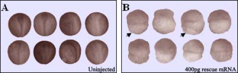 Fig. 4. Overexpression of xSH3BP5L in X. laevis. (A) Uninjected embryos showed normal at stage-15. (B) Microinjection of 400 pg xSH3BP5L mRNA caused failed blastopore closure (black arrowheads).