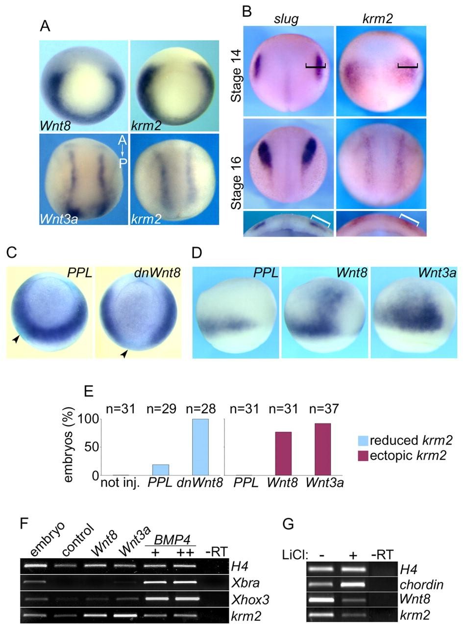 Fig. 1. In Xenopus, Krm2 is regulated by Wnt signaling and expressed in the NC region. (A-D) Whole-mount in situ hybridizations. (A) Comparison of Xkrm2, XWnt8 and XWnt3a expression patterns in gastrula and early neurula stage embryos. Top: gastrula stage. Vegetal view, dorsal is up. Bottom: neurula stage. Dorsal view, anterior is up. (B) Comparison of Xkrm2 and slug expression patterns at the indicated stages. Dorsal view, anterior is up. Lowermost panel: view of frontally cut stage 16 embryos, dorsal is up. Brackets indicate overlapping expression domains of krm2 and slug. (C-E) Effect of Wnt pathway perturbations on krm2 expression. (C) Embryos at the 32-cell stage were injected equatorially in two opposite blastomeres with 1 ng PPL or dnWnt8 and 250 pg lacZ mRNA and analyzed at gastrula stage. Arrowheads indicate β-gal lineage tracer staining (blue). Vegetal view, dorsal is up. (D) Embryos at the four-cell stage were injected animally with 200 pg pCS-PPL or pCSKA-Wnt8 DNA or 100 pg pCS-Wnt3a DNA in one blastomere and analyzed at gastrula stage. Lateral view, dorsal to the right. (E) Statistical overview of experiments shown in C and D. (F) Embryos at the four- to eight-cell stage were injected animally with 100 pg XWnt8 or Wnt3a mRNA, or 1 or 2 ng BMP4 mRNA. Animal caps were cut at stage 8-9, cultured until stage 20 equivalent and were analyzed by RT-PCR for expression of the indicated genes. (G) Embryos at the 32-cell stage were treated with 120 mM LiCl for 50 minutes, cultured until stage 11.5 and analyzed by RT-PCR. Histone H4 was used for normalization. -RT, minus reverse transcriptase control.