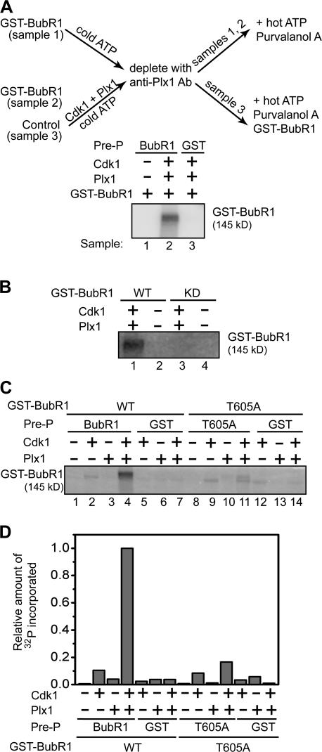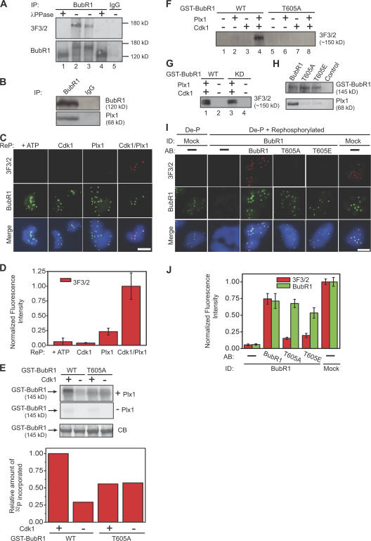 Accurate chromosome segregation is controlled by the spindle checkpoint, which senses kinetochore- microtubule attachments and tension across sister kinetochores. An important step in the tension-signaling pathway involves the phosphorylation of an unknown protein by polo-like kinase 1/Xenopus laevis polo-like kinase 1 (Plx1) on kinetochores lacking tension to generate the 3F3/2 phosphoepitope. We report here that the checkpoint protein BubR1 interacts with Plx1 and that phosphorylation of BubR1 by Plx1 generates the 3F3/2 epitope. Formation of the BubR1 3F3/2 epitope by Plx1 requires a prior phosphorylation of BubR1 on Thr 605 by cyclin-dependant kinase 1 (Cdk1). This priming phosphorylation of BubR1 by Cdk1 is required for checkpoint-mediated mitotic arrest and for recruitment of Plx1 and the checkpoint protein Mad2 to unattached kinetochores. Biochemically, formation of the 3F3/2 phosphoepitope by Cdk1 and Plx1 greatly enhances the kinase activity of BubR1. Thus, Cdk1-mediated phosphorylation of BubR1 controls checkpoint arrest and promotes the formation of the kinetochore 3F3/2 epitope.