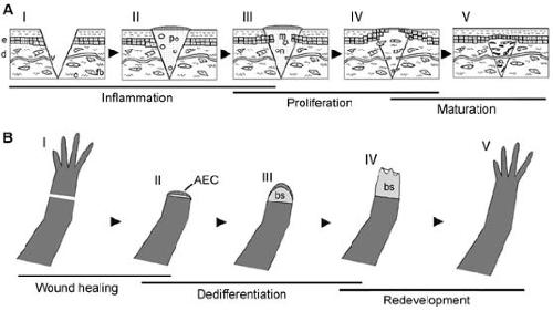 c, collagen d, dermis; e, epidermis; fb, fibroblast; m, macrophage; n, neurotrophil; p, platelet; v, blood vessel. (B) Limb regeneration