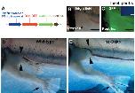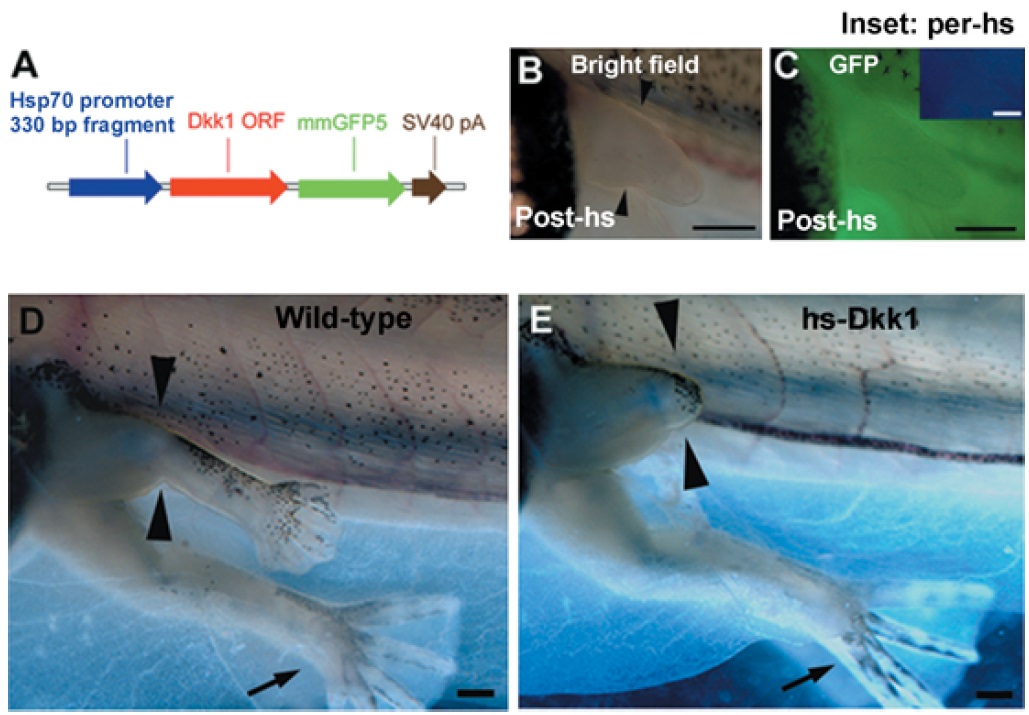 (A) Map of the heat shock-inducible Dkk1GFP transgene. (B) Bright field and (C) fluorescent view of transgenic tadpoles carrying this transgene 3â4 h after heat shock. No green fluorescent protein (GFP) expression was detected in the same tadpole before heat shock (inset). (D) A wild-type tadpole heatshocked prior to amputation regenerated the limb completely. (E) The hs-Dkk1GFP tadpole heatshocked prior to amputation did not regenerate the limb. Note that un-amputated rightlimb buds developed normally (black arrows). Arrowheads show the presumptive knee level (amputation level). Bar, 500 μm.