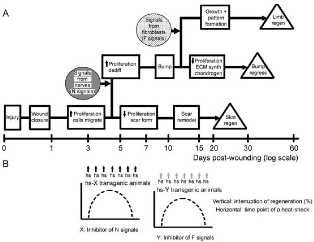 limb regeneration will be significantly blocked by heat shock at the time point when the stepwise signals are required for the promotion