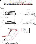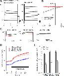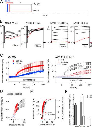 Figure 3. MTS reaction rate is slowed in the KCNQ1–KCNE1 complex. (A) Pulse protocols for MTSES application. Depolarizing pulses (to +40 mV) with durations of 30 ms (blue), 300 ms (red), or 3 s (black) were applied every 10 s. (B) Representative traces for A226C (30 ms), A226C (300 ms), A226C+KCNE1 (300 ms), and A226C+E1 (3 s). Traces obtained just before applying MTSES are shown in red; those obtained 1, 2, 3, 4, and 5 min after the onset of MTSES application are shown in black. (C) Time courses of the MTSES reaction with A226C and A226C+KCNE1 with 30-ms (blue), 300-ms (red), and 3-s (black) depolarizing pulses. The timing of the MTSES application is indicated by black bars. (D) Time courses of MTSES reaction are replotted as functions of “exposure (mM sec)” (see Materials and Methods) of A226C+KCNE1 elicited by 30-ms (blue), 300-ms (red), and 3-s (black) depolarizing pulses. (E) Time courses of the MTSES reaction with 300-ms pulses in terms of “exposure” are compared between A226C and A226C+KCNE1 (E1). Filled red symbols represent A226C, open black symbols A226C+KCNE1. (F) Apparent second order rate constants are plotted. Although time courses of MTSES reaction with A226C (300 ms) and A226C+KCNE1 (3 s) were fitted by a double exponential function, only the faster time constants were used for calculation of the apparent second order rate constants. Filled bars represent rate constants without KCNE1, open bars the rate constants with KCNE1; **, P < 0.01.