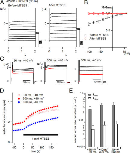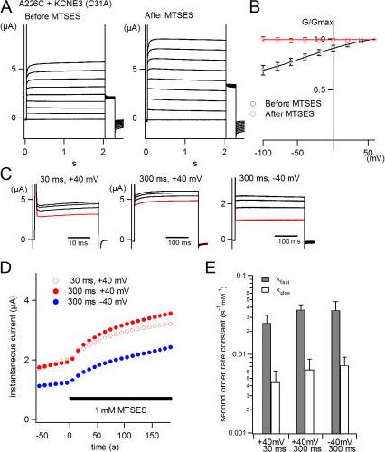 Figure 5. The rate of MTS reaction with the KCNQ1–KCNE3 complex is voltage independent. (A) Representative traces obtained from oocyte coexpressing KCNQ1 (A226C) and KCNE3 (C31A) before and 5 min after application of 1 mM MTSES. Membrane potential was stepped from a holding potential of −100 to +60 mV in 20-mV increments. (B) G-V relationships for A226C+KCNE3 before (black) and after (red) MTSES application. (C) Representative traces obtained with 30-ms depolarizations to +40 mV or 300-ms depolarizations to +40 or −40 mV in oocytes expressing A226C+KCNE3. Traces just before applying MTSES are shown in red; those recorded 1, 2, and 3 min after the onset of MTSES application are shown in black. (D) Time courses of the MTSES reaction with A226C+KCNE3. Error bars were omitted for clarity. The timing of MTSES application is indicated by a black bar. (E) Two second order rate constants (kfast and kslow) are plotted for each protocol. They are calculated from two time constants obtained from D fitted using a double exponential function.