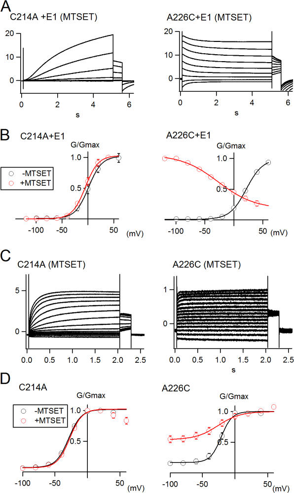 Figure 2. Reaction with MTS reagents locks A226C mutant open. (A) Representative traces for C214A and A226C obtained in the presence of KCNE1 (E1) after a 30-min pretreatment with 1 mM MTSET. A226C was stabilized in the open state after MTSET treatment. Membrane potential was stepped from −120 to +40 mV in 20-mV increments. Holding potential was −90 mV. (B) G-V curves with (red) and without (black) MTSET pretreatment in the presence of KCNE1. (C) Representative traces for C214A and A226C obtained in the absence of KCNE1 after a 30-min pretreatment with 1 mM MTSET. Membrane potential was stepped from −100 to +60 mV in 20-mV increments. Holding potential was −80 mV. (D) G-V curves with (red) and without (black) MTSET pretreatment in the absence of KCNE1.