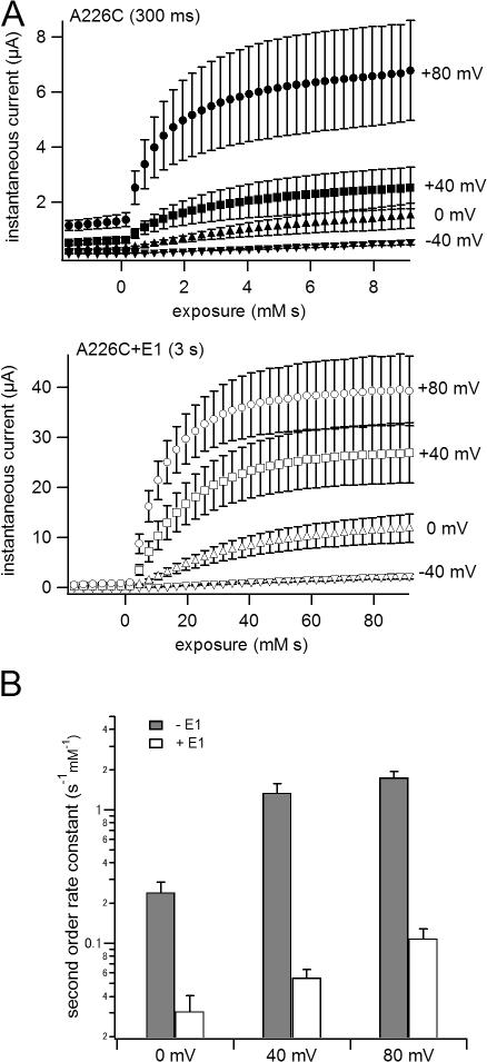 Figure 4. MTS reaction rate is voltage dependent. (A) Time courses of MTSES reaction with A226C (300 ms) and A226C+KCNE1 (3 s) with depolarization to −40, 0, +40, and +80 mV are shown. (B) Apparent second order rate constants are plotted against voltage. Although time courses of the reaction with depolarizations to +40 and +80 mV were fitted with double exponential function, only the faster time constants were used for the calculation of the apparent second order rate constants. Filled bars represent rate constants without KCNE1, open bars the rate constants with KCNE1.