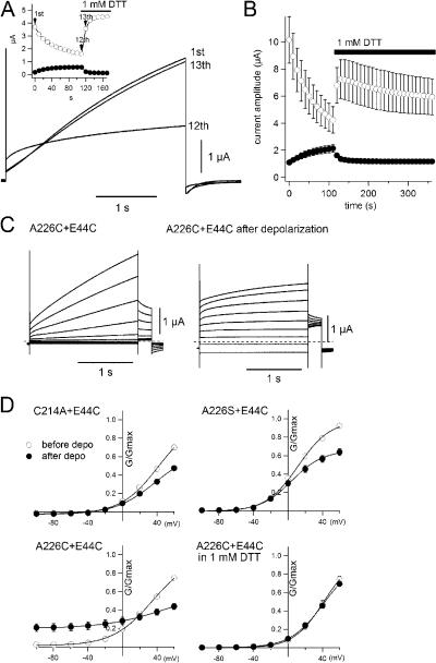 Figure 6. A disulfide bond can form between KCNE1 and S4 of KCNQ1. (A) Current traces recorded from an oocyte coexpressing KCNQ1 (A226C) and KCNE1 (E44C) are shown. The oocyte was repetitively depolarized to +40 mV for 3 s every 10 s. Only the 1st, 12th, and 13th traces are shown. The current gradually ran down until by the 12th depolarization it was nearly flat. With subsequent addition of 1 mM DTT, the current immediately recovered the slow activation (13th depolarization). Thereafter, slow activation was retained in DTT. (inset) Time course of the run down and recovery by DTT. Filled and open symbols represent the instantaneous currents and the currents at the end of the depolarization, respectively. Black bar represents the presence of 1 mM DTT in the bath solution. (B) Time course of current amplitude upon DTT application (n = 5). Filled and open symbols represent the instantaneous currents and the currents at the end of the depolarization, respectively. Black bar represents the presence of 1 mM DTT in bath solution. (C) Representative traces obtained from oocyte coexpressing KCNQ1 A226C mutant and KCNE1 E44C mutant. Membrane potential was stepped from a holding potential of −100 to +60 mV in 20-mV increments. After the first set of voltage pulses (left), oocyte is depolarized at +40 mV for 1 min to facilitate the disulfide formation. Second set of voltage pulses was applied after 1 min depolarization (right). (D) G-V curves for the KCNQ mutants with KCNE1 (E44C) mutant. Open and filled symbols represent G-V curves before and after 1 min depolarization at +40 mV, respectively.