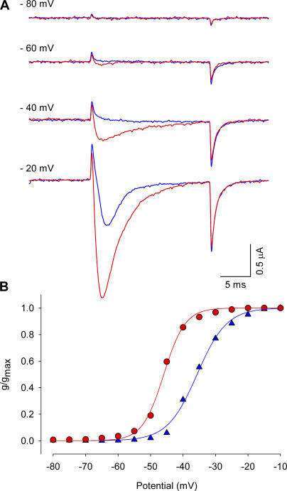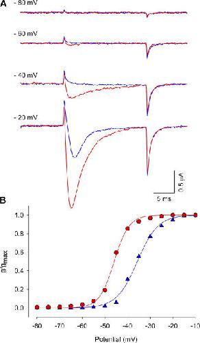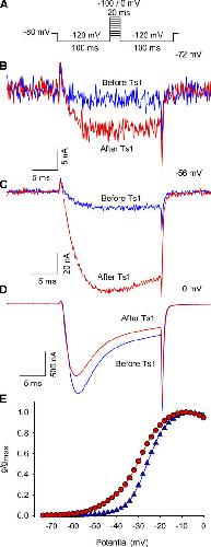 Figure 1. Effect of Ts1 in the sodium currents activation. (A) Voltage protocol used to record the inward sodium currents. (B) Superimposed sodium currents obtained at −72 mV before (blue trace) and after (red trace) the treatment with 50 nM of Ts1. (C) Superimposed sodium currents obtained at −56 mV before (blue trace) and after (red trace) the treatment with Ts1 (50 nM). (D) Superimposed sodium currents obtained at 0 mV before (blue trace) and after (red trace) the treatment with Ts1 (50 nM). (E) Superimposed G-V curves obtained before (blue symbols) and after (red symbols) the treatment with Ts1 (25 nM). |