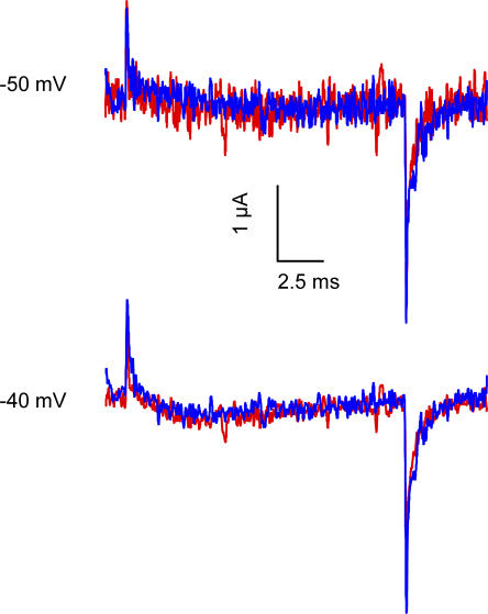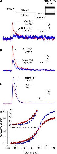 Figure 3. Effect of Ts1 on gating currents. Superimposed gating current traces elicited by a test pulse to −150 mV (A), −100 mV (B), and 0 mV (C) in control conditions (blue line) and in the presence of 50 nM Ts1 (red line). (A, inset) Voltage protocol used to record the currents. (D) Charge–voltage (Q-V) relationships (normalized to the maximum charge in control conditions) in the presence of Ts1 (red circles) and in control conditions (blue triangles). Solid and dashed traces are the fits to the function in Eqs. 3 and 4, respectively (see Materials and Methods). See Table I for fitted parameters. |