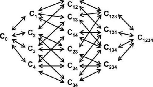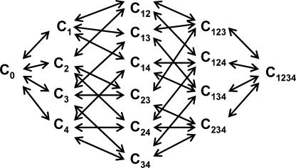 Figure 9. A general kinetic model for gating in a voltage-gated ion channel. C0 corresponds to the fully deactivated state, with all four S4 segments in the resting position. C1, C2, C3, and C4 correspond to the states where voltage sensors from domains I, II, III, and IV are activated. The numbers in the index refers to voltage sensors that are in activated position. C1234 corresponds to the fully activated state and the open channel form, with all the S4 segments in the activated position. |