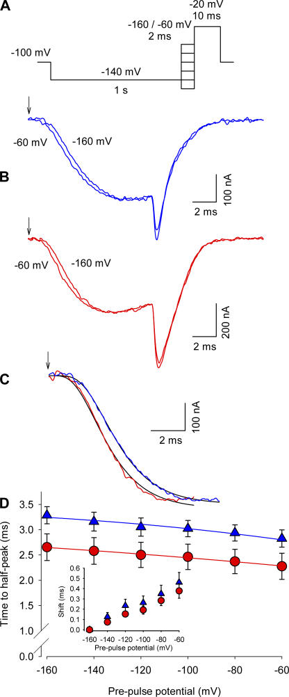 Figure 2. Effect of Ts1 in the Cole-Moore shift. (A) Voltage protocol used to measure the Cole-Moore shift. (B, top) Superimposed sodium currents obtained in the absence of Ts1, following a prepulse to −60 mV (lefthand trace) or −160 (righthand trace). (B, bottom) Superimposed sodium currents obtained in the presence of Ts1 (100 nM), elicited as described above for the control conditions. (C) Superimposed sodium currents (prepulses to −160 mV) recorded in control conditions (blue line) and in the presence of Ts1 (red line). Black lines are the fits to the function in Eq. 1 (see Materials and Methods). Arrows in A and B indicate the beginning of the pulse. (D) Time to the half-maximal sodium current for indicated potentials in control conditions (blue triangles) and in the presence of Ts1 (red circles). The inset shows the time shift necessary to superimpose the currents for the indicated potentials with respect to the currents at −160 mV (control, blue triangles; in presence of Ts1, red circles). Blue and red lines are the fits to the function shown in Eq. 2. The parameters obtained for the curve in the absence of Ts1 were z = 2.3; Vh = 0 mV; the parameters obtained in the presence of Ts1 were z = 4.4; Vh = −17.7 mV. |