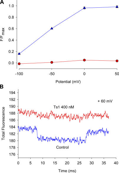 Figure 6. Effect of Ts1 on S4-DII movement. (A) Voltage protocol used to measure the fluorescence signals. Superimposed fluorescence traces recorded at +50 mV (C), 0 mV (D), −50 mV (E), and −100 mV (F) in control conditions (blue lines) and in the presence of Ts1 (0.5 μM, red lines). The fluorescence increases in the same direction of the arrow in the scale bar. |