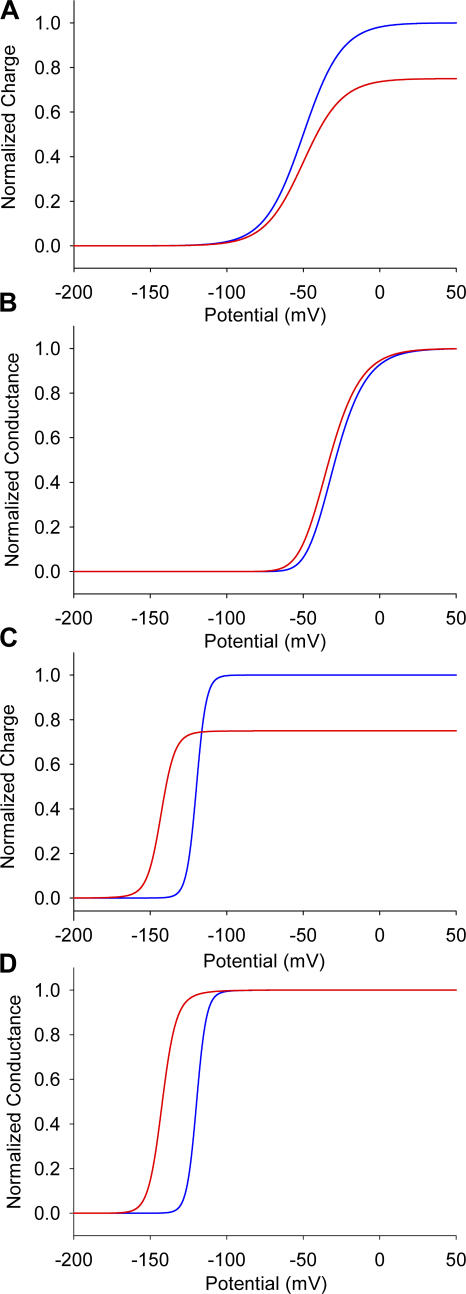 Figure 10. Modulation of gating in independent and allosteric models. Simulations of the charge–voltage (A) and conductance–voltage curves (B) for the model with independent voltage sensors. Charge–voltage (C) and conductance–voltage (D) curves in the allosteric model, where all four voltage sensor movements are coupled. Toxin-modified data are shown as red lines, whereas the unmodified traces are shown as blue lines. |